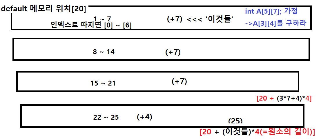 (배열의 시작주소) + {(목표 행)*(배열의 최대 열)+(목표 열)} * (원소의 길이)